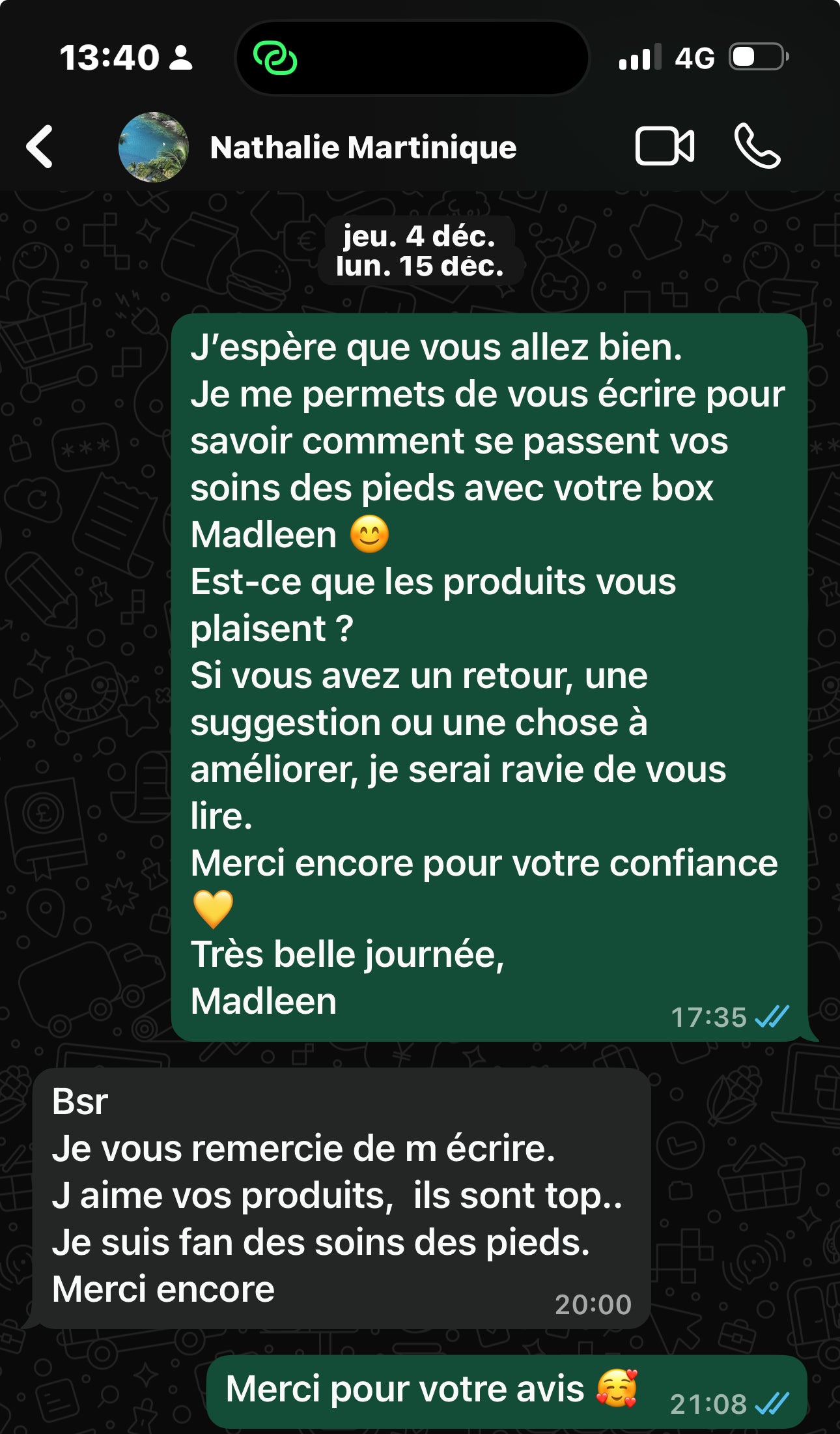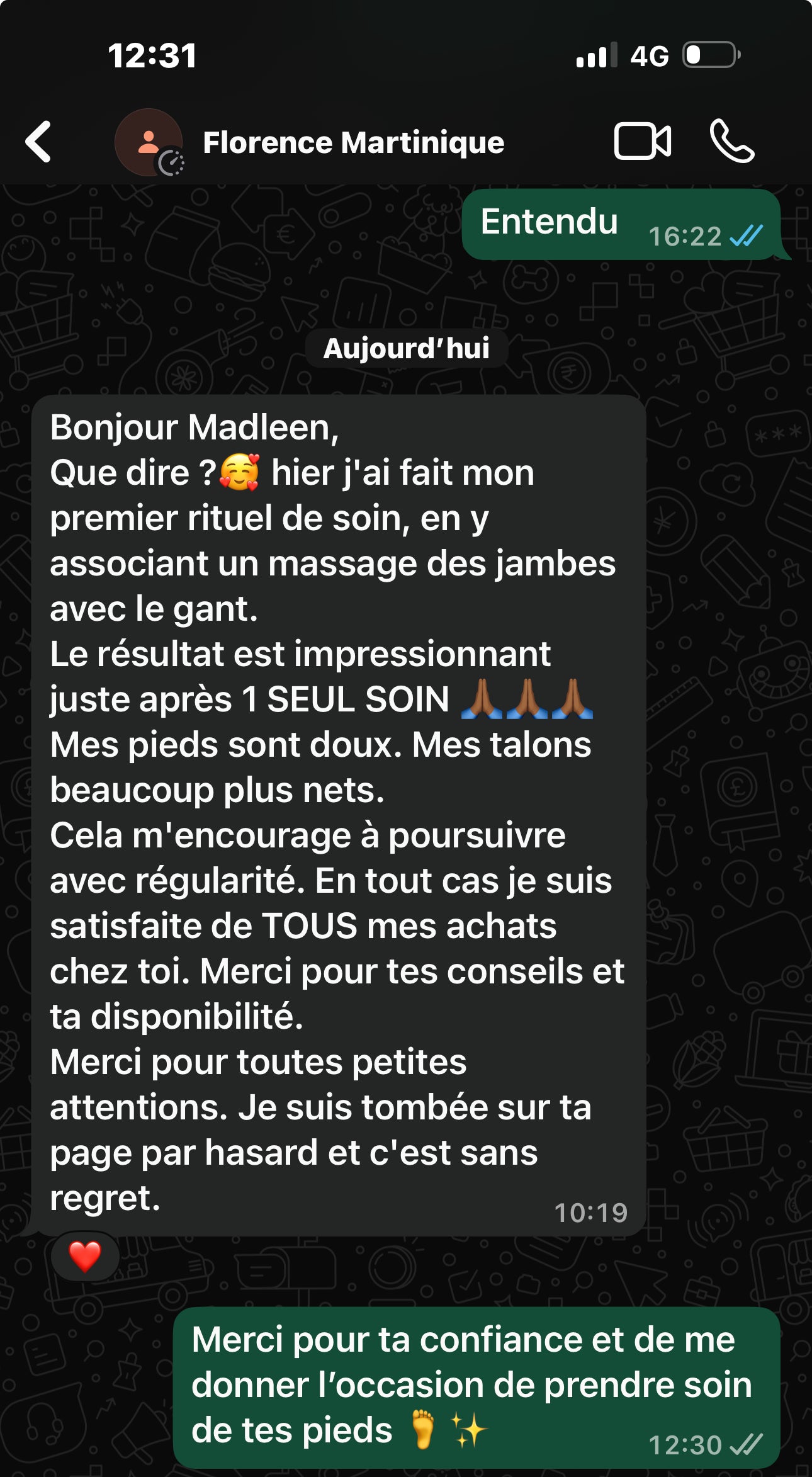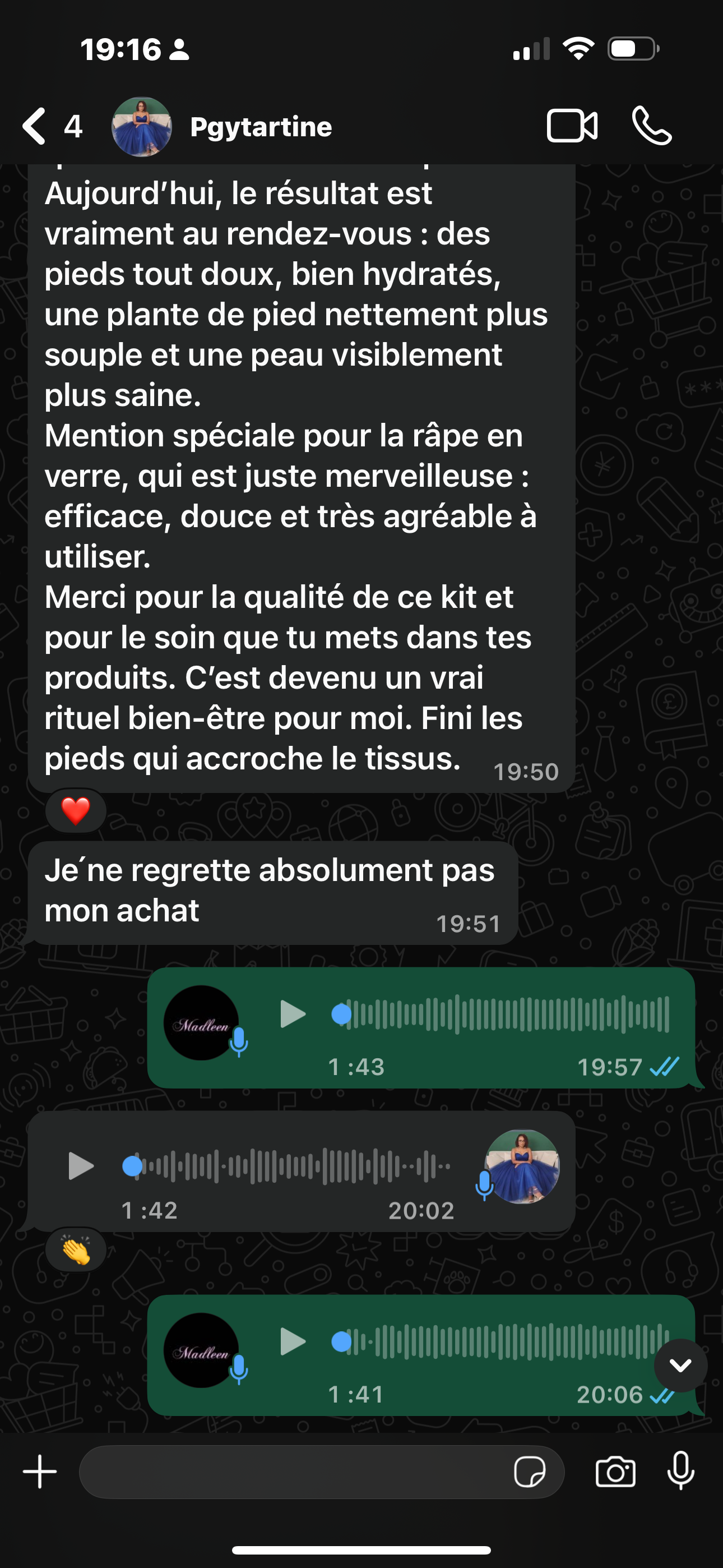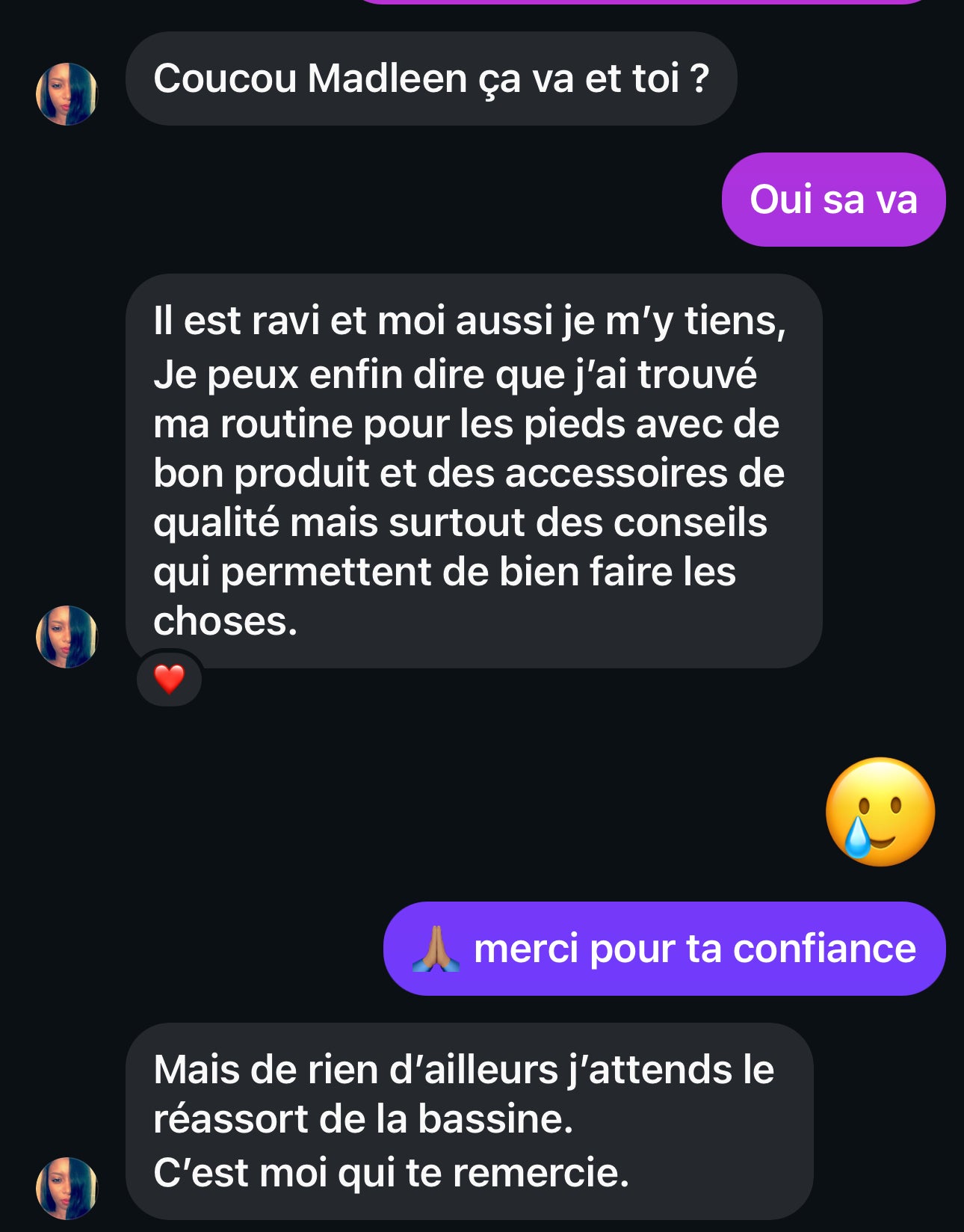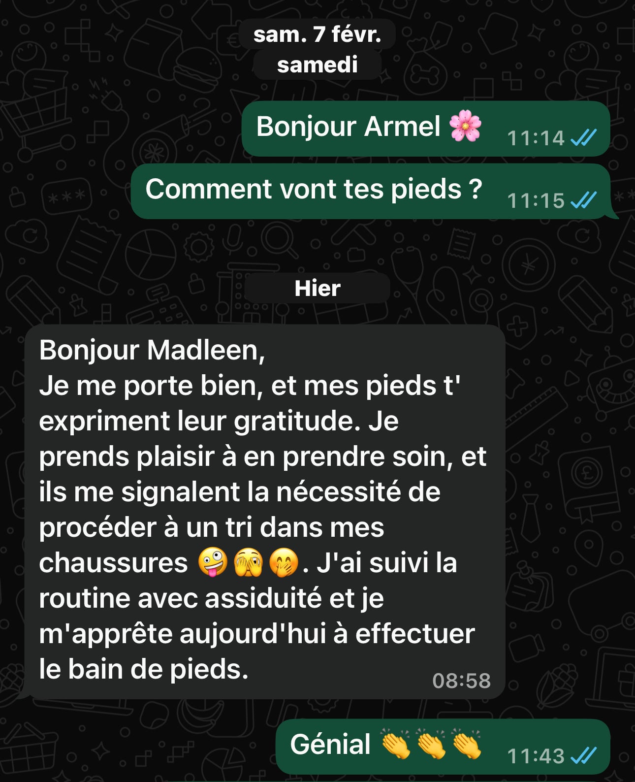 Voici son résultat après 2 semaines d'entretien avec la Méthode Madleen, des pieds plus lisses, plus doux et visiblement soignés.