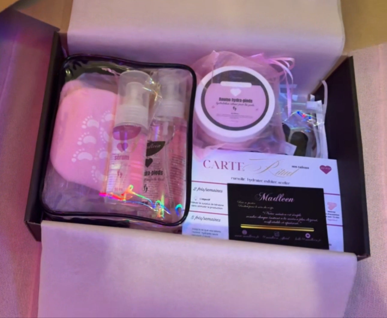 Une box tout-en-un: produits de soin, accessoires, carte virtuelle. La Méthode Madleen est conçue pour entretenir les pieds à la maison et permettre d’obtenir des pieds visiblement plus beaux. Elle aide à affiner le grain de peau, lisser les talons, maintenir une hydratation durable, et retrouver des pieds doux, souples et parfaitement soignés.